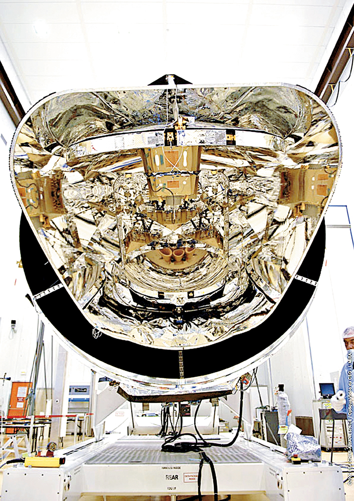 圖:圖為普朗克太空望遠鏡的聚焦鏡面。普朗克在太空慢慢轉動,並對天空作出掃描,把輻射聚焦導入兩台低頻率和高頻率的高靈敏度探測器中(法新社)