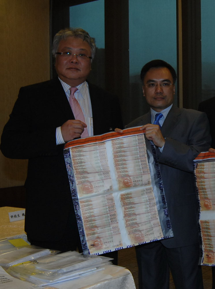 圖:高級警司杜漢基(左)講述案情及展示搜獲的債款 (俞凱穎攝)