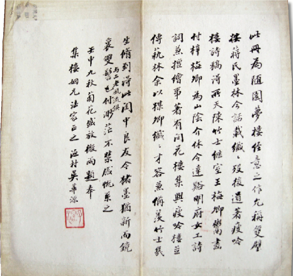 其三,銘後有淡墨蘭花一幀,堪得歐波遺意,乃陳竹士繼室所作。纖纖歿後,遺著《瘦吟樓詩稿》,得竹士繼室王梅卿鬻畫付梓,梅卿工詩詞,兼擅繪事,通音律,著有《問花樓集》,與《瘦吟樓詩稿》並傳藝林。後有長洲章鈺題調寄惜紅衣一闋,著名書畫家吳華源跋語曰:「此冊為隨園夢樓經意之作,允稱雙璧。余以為纖纖、梅卿亦雙璧也。
