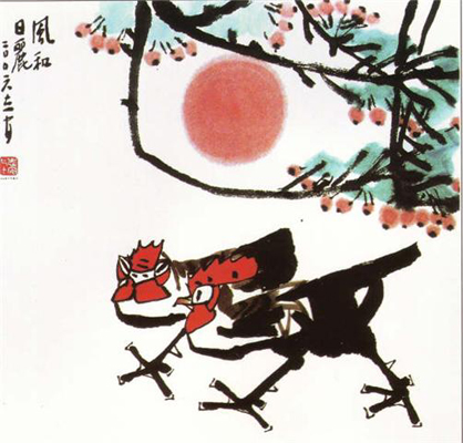 在張志安的畫幅中,就有《於今電孵化,何處找媽媽》、《依舊刺骨寒》、《何必合群》。又有《才見寒徹骨,正見梅花開》、《迎春》、《霞光滿道》。而不堪回首的是《君亦有雙翅,何以不翱翔?》、《冠服傳神甚,命運殊可悲》。所以他在一幅畫上曾題:「紅冠利爪,亦有雄風,然終是餐中物。」然而,作為生物,如前所說,既有生的艱難,亦有生的歡樂。所以依然《春風得意》、《亦知卿卿我我》、《自信前程花似錦》。春夏秋冬循環過,亦知趨利避禍,便有《夏日炎炎》、《瓜蔭涼》。