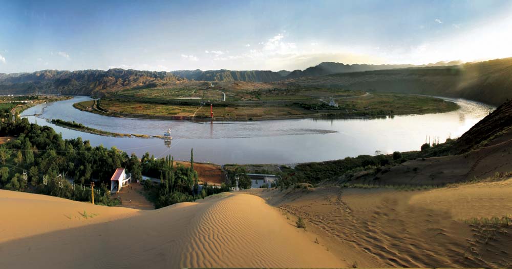 天下黃河富寧夏,天下黃河美寧夏。黃河寧夏段經黑山峽奔騰而來,沿着浩瀚的騰格里沙漠邊緣流入寧夏,全程397公里。這裡的黃河水一改往日的狂野不羈,水勢舒緩,坦坦蕩蕩,雄渾壯觀。以她的溫厚、大氣磅礴使得寧夏平原阡陌縱橫、平疇沃野、稻香魚肥。因為黃河,朔漠大野才有了塞上江南的景色,才有了平原溝渠湖泊的明媚潤澤,才有了「塞上江南」、「天下黃河富寧夏」之美稱。