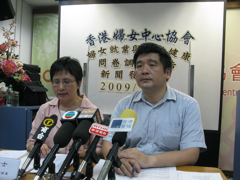 圖:香港婦女中心協會呼籲政府關注貧困婦女的失業問題。左為香港婦女中心協會總幹事方旻煐,右為香港中文大學社會工作學系副教授黃洪