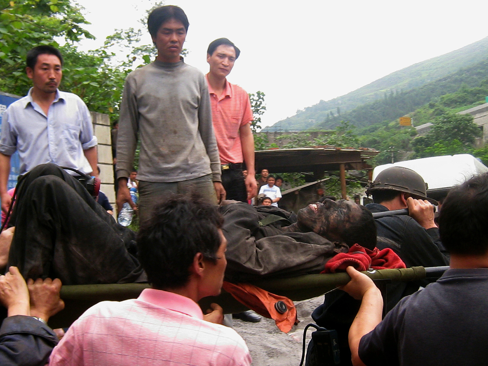 圖:重慶同華煤礦30日發生特大瓦斯突出事故,造成30人死亡,77人受傷。圖為一名受傷的礦工被救出事發現場(法新社)