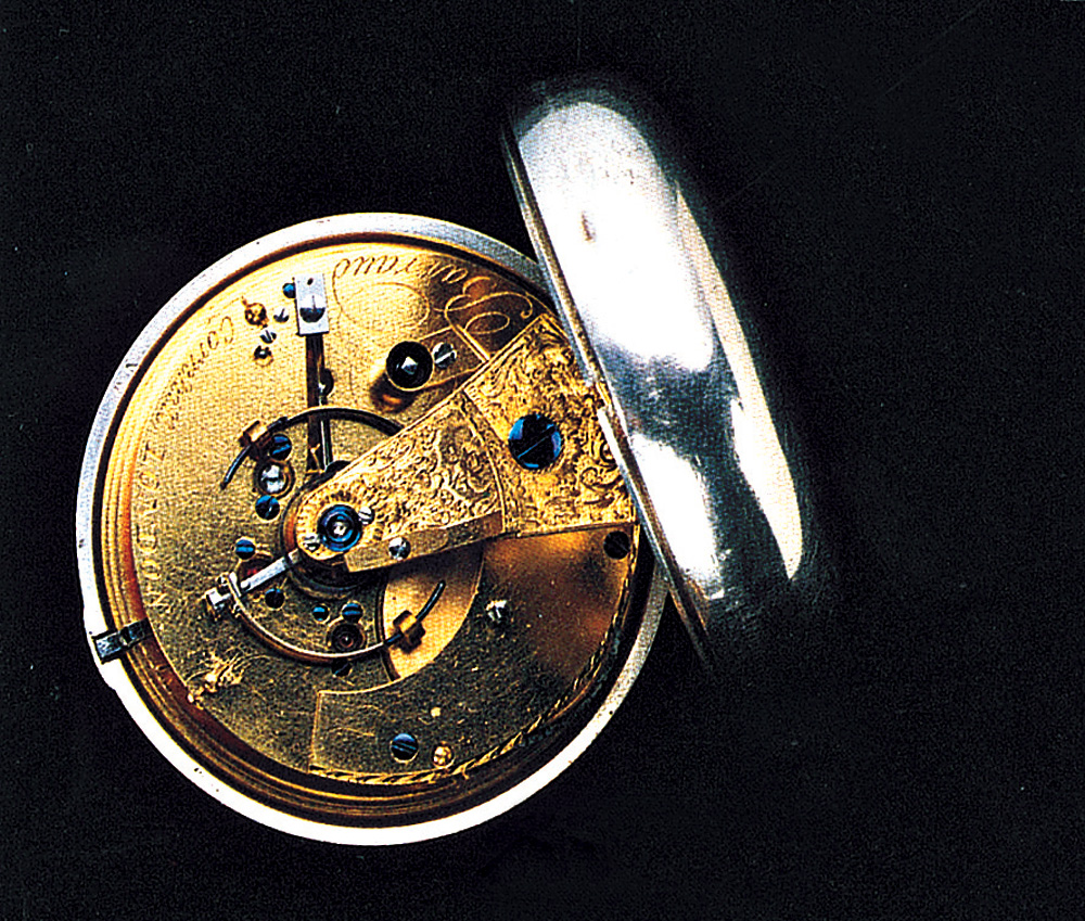 機械表刻度盤上這些英文字一定要原裝,從出廠保存至今不變。有些特殊的高級袋表則刻在表殼內。像附圖就是一七九七年(十八世紀末)在英國倫敦出廠的銀殼(九二五)白瓷面計秒袋表,屬舊式的跳秒裝置,為蟹爪型的複式擒縱器,配合「補擺」與晏諾德古老彈簧。藏玩古袋表的有識見人士皆知此乃稀品,難得遇見。這種特殊機械裝置首見於十八世紀末,至十九世紀中期就幾乎絕跡,故存世者不多。其表殼內便原裝刻上「TIME PIECE」的英文字樣。現今玩慣近代腕表者可能不知其珍貴處。
