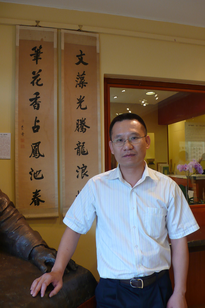 圖:「雙魁堂」主人王展南攝於清代唯一一位蒙古人狀元崇綺的墨跡前(本報攝)