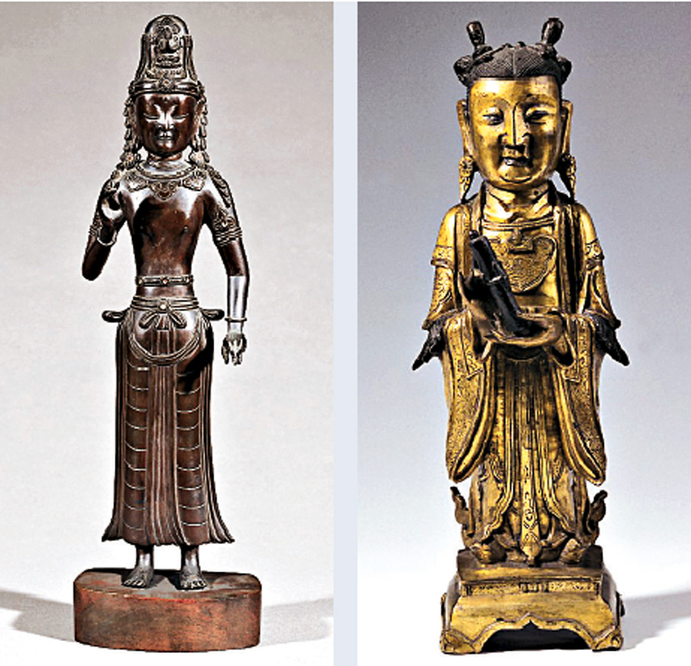 圖:(左圖)十二世紀大理國銅觀音立像。(右圖)明銅鎏金眼光娘娘立像(龐博提供)