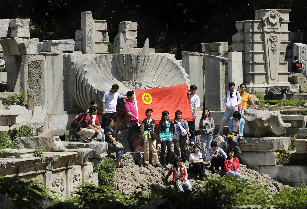 圖:圓明園管理處將對大水法進行大規模的保護試驗。圖為一群青年在圓明園遺址公園內的海晏堂遺址前留影(新華社)