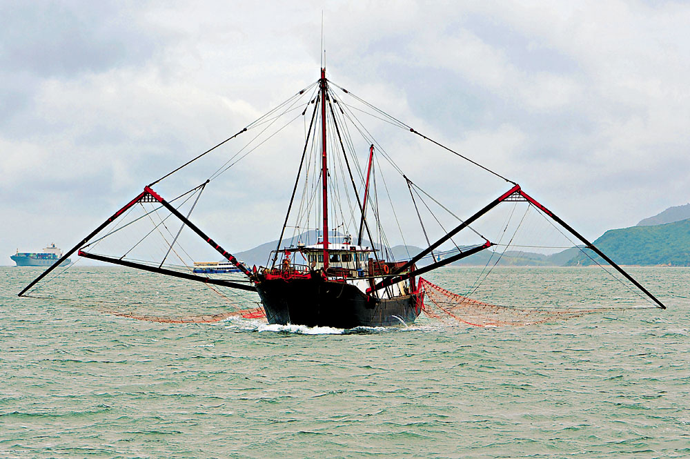 圖:「摻繒」是其中一種拖網捕魚作業的方式。船舷兩旁的特設木架掛有長網袋,伸入水中捕捉在近水面層棲息的魚類
