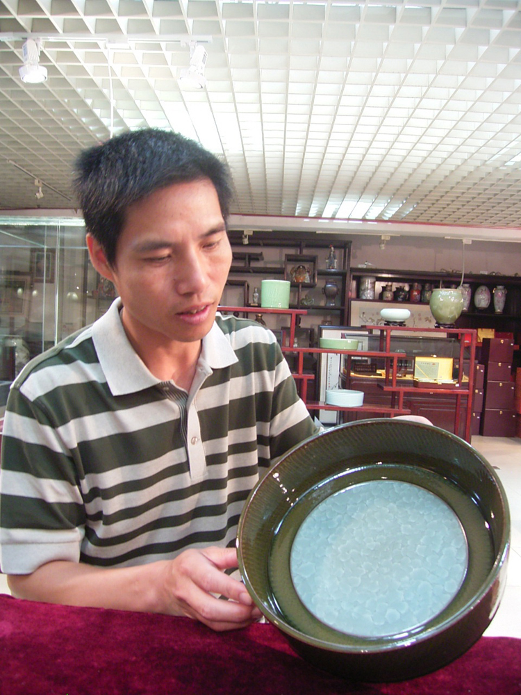 1996年,一位日本客商給深諳青瓷胎釉配方的龍泉陶瓷工藝美術師葉小春發來了一份古代冰裂紋的傳真照片,並希望他能「再生復活」古代哥窰極品冰裂紋。出生於青瓷世家的葉小春,很小就學會了挖礦土、拉坯成型、配製胎釉和燒製工藝。面對日本客商發來的照片,葉小春深深被這種從未見到過的獨特裂紋所吸引。為此,葉小春走遍了龍泉古窰址,四處尋找古代遺留的冰裂紋碎片,並試製配方上百種,易稿數千次,但沒有一次燒製的成品有冰裂紋的跡象。