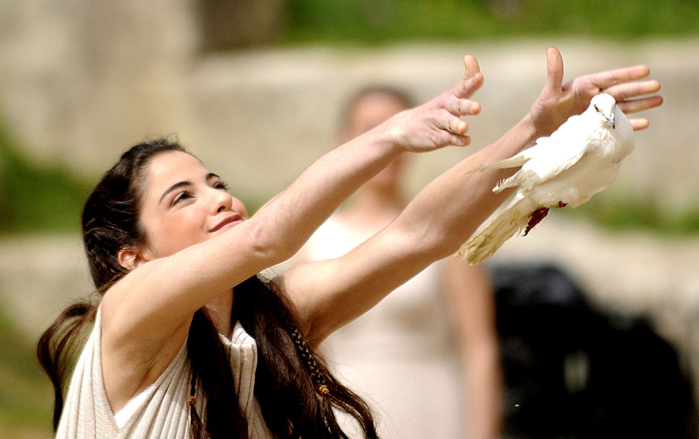 圖:京奧聖火取火儀式在希臘舉行,女祭司放飛白鴿
