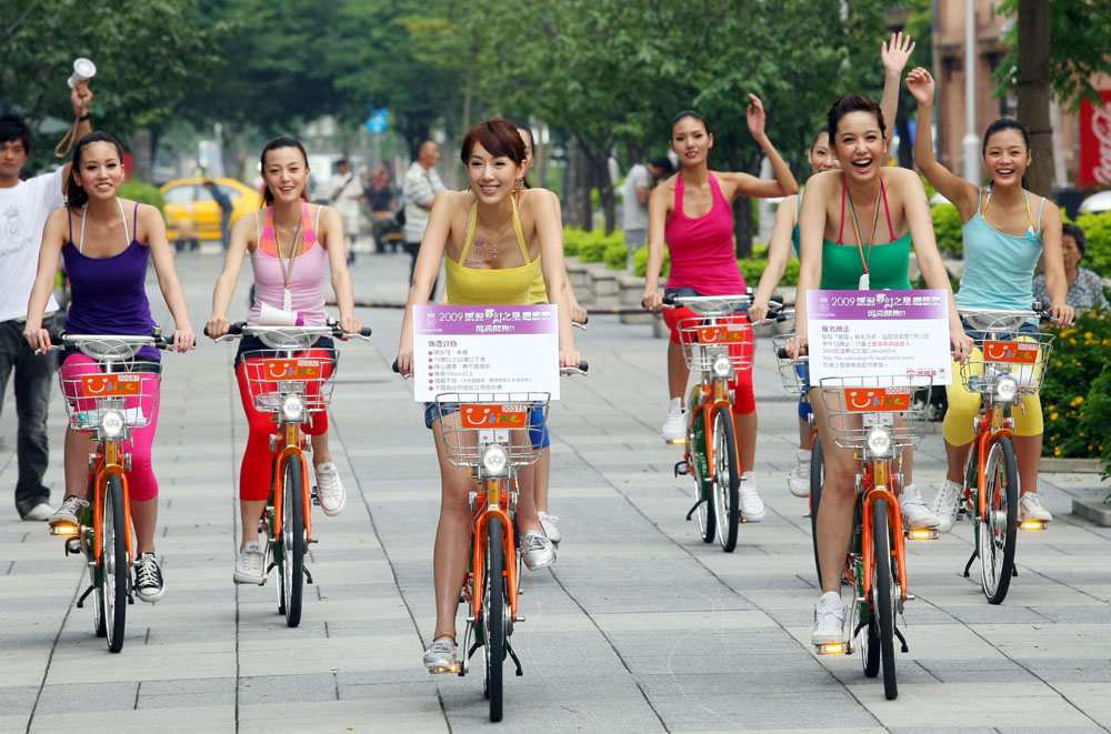 台灣名模隋棠(左三)與一眾美女十九日在台北街頭騎上「U Bike微笑單車」,宣傳二○○九年的「夢幻之星」選拔賽。(中央社)