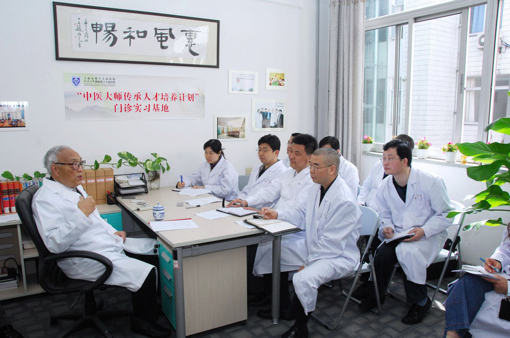 圖:作為國家級中醫傳承工作試點項目,內地早前啟動了「中醫大師傳承人才培養計劃」。圖為今年4月,「國醫大師」之一的顏德馨(左一)以90高齡在上海某醫院為來自全國各地的學員傳道授業(資料圖片)