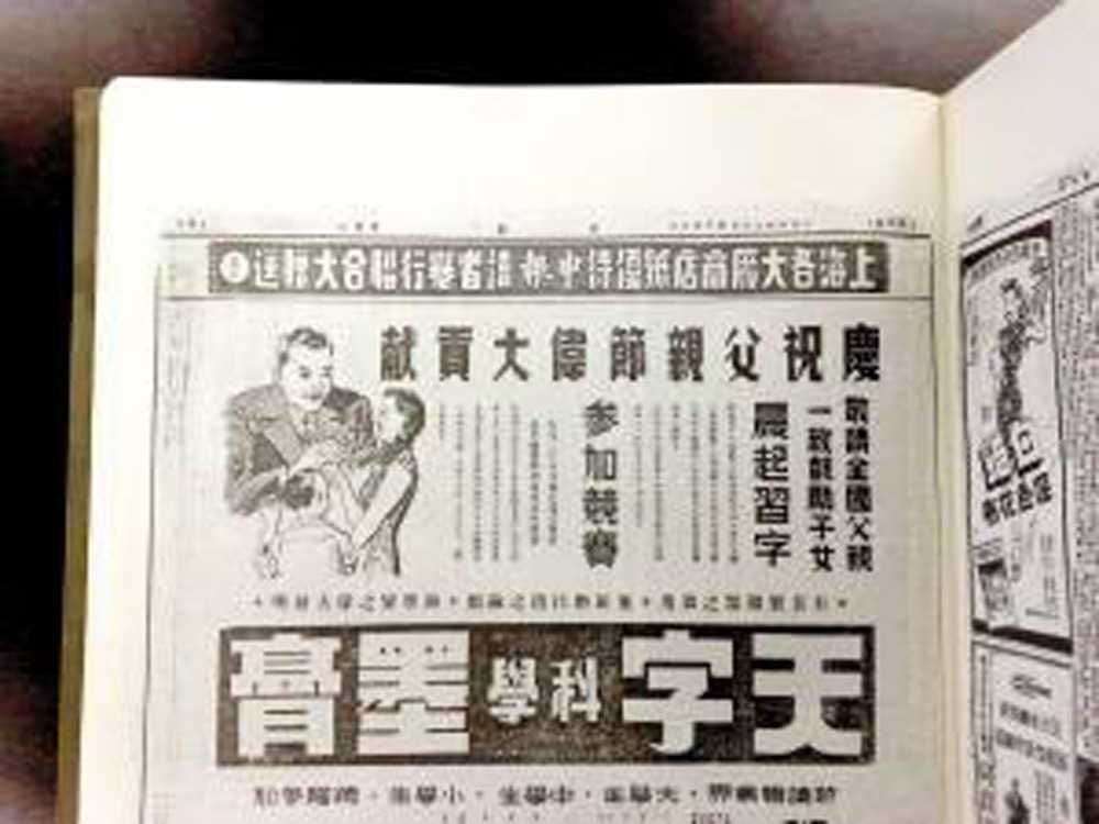 另外,《申報》刊登了一則以《慶祝父親節偉大貢獻》為大標題的1/3版墨膏廠廣告,副標題為《敬請全國父親一致鼓勵子女晨起習字》,發動「父親節書法競賽活動」。