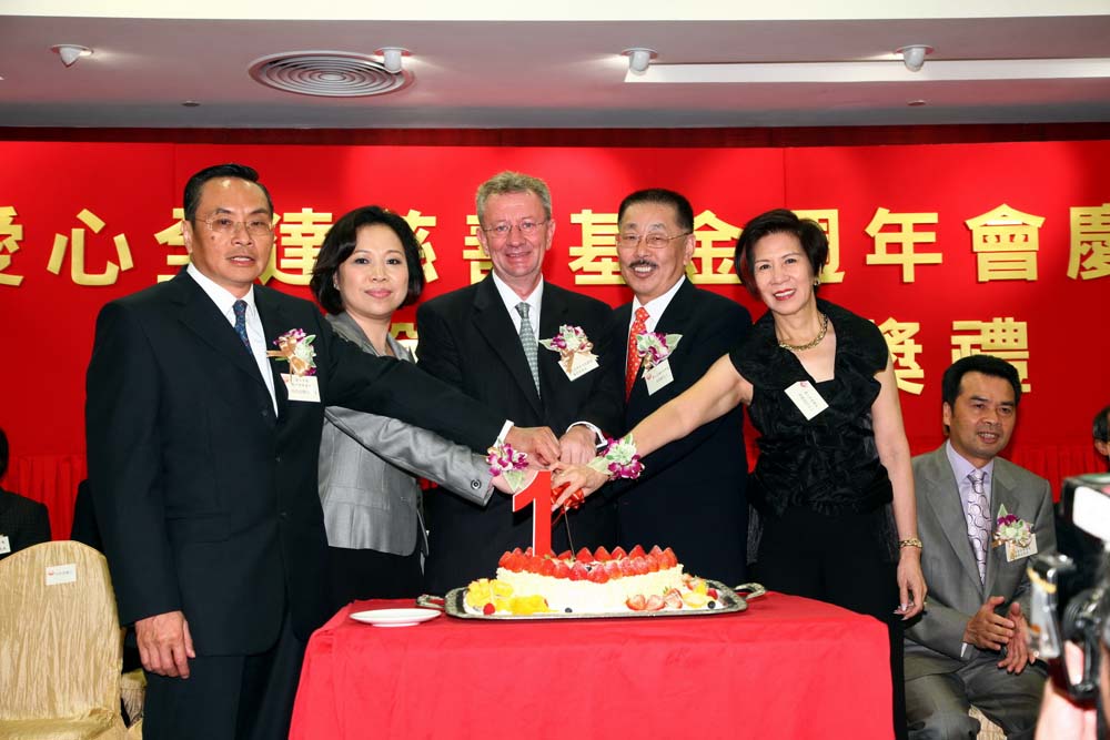 圖:「愛心全達」慈善基金周年會慶暨愛心醫護人員頒獎禮上,主禮嘉賓切蛋糕慶賀,左起:吳偉達、潘陳愛菁、蘇利民、余柏岐、梁劉燕珍