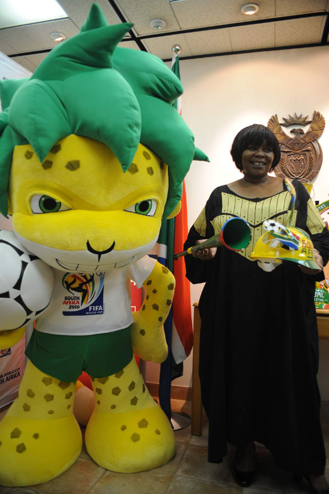南非駐香港及澳門總領事譚諾娜(右)昨公布領事館未來1年的世界杯宣傳活動,包括國際足聯代表及南非足聯主席佐丹在10月來港為機場的世界杯倒數計時器揭幕。左為世界杯吉祥物Zakumi。(本報攝)