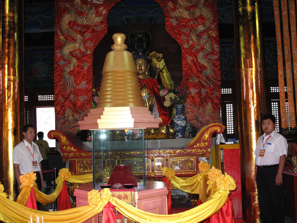為保護國寶,整個毗盧殿展覽區安排了同四層武警和保安守衛。其中,隔離帶四個角落由四名佩槍武警看守。據悉,毗盧殿的空中、地面已安裝了攝像頭,控制室可24小時全方位監控殿內情況。