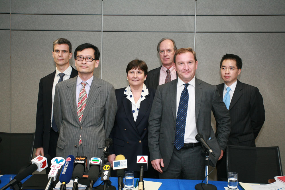 圖:(左起)穆迪金融機構部高級副總裁溫沛睿、亞太區董事總經理簡宗正、穆迪高級副總裁舒寶樂、亞洲及中東信用評級主任湯貝爾、主權風險部董事總經理Pierre Cailleteau、高級分析師華志行 (本報攝)