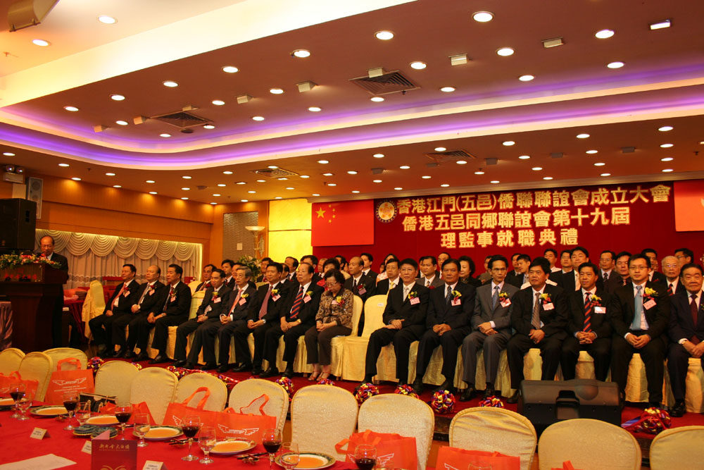 香港江門(五邑)僑聯聯誼會成立大會暨僑港五邑同鄉聯誼會第十九屆理監事就職禮,日前在北角新都會大酒樓舉行。應邀出席主禮的嘉賓包括中聯港島工作部部長吳仰偉、九龍工作部副部長容福華、新界工作部副部長李文,中國僑聯副主席廣東省僑聯主席王榮寶,全國政協常委余國春,廣東社團總會主席王國強,江門市政協主席趙基耀,江門市委副書記譚繼祖,江門市副市長謝日榮,立法會議員李慧琼、譚偉豪,香港潮州商會會長許學之等,各界賢達、友好逾七百人歡聚一堂,同申慶賀。