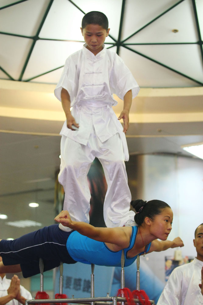 台灣中華少林禪武協會昨日邀請大陸武術精英訪問團,在台北地下街表演少林功夫。圖為練成金鐘罩鐵布衫武藝絕學的郝娟娟(圖下方)演出「懸空五槍刺身」。(中央社)