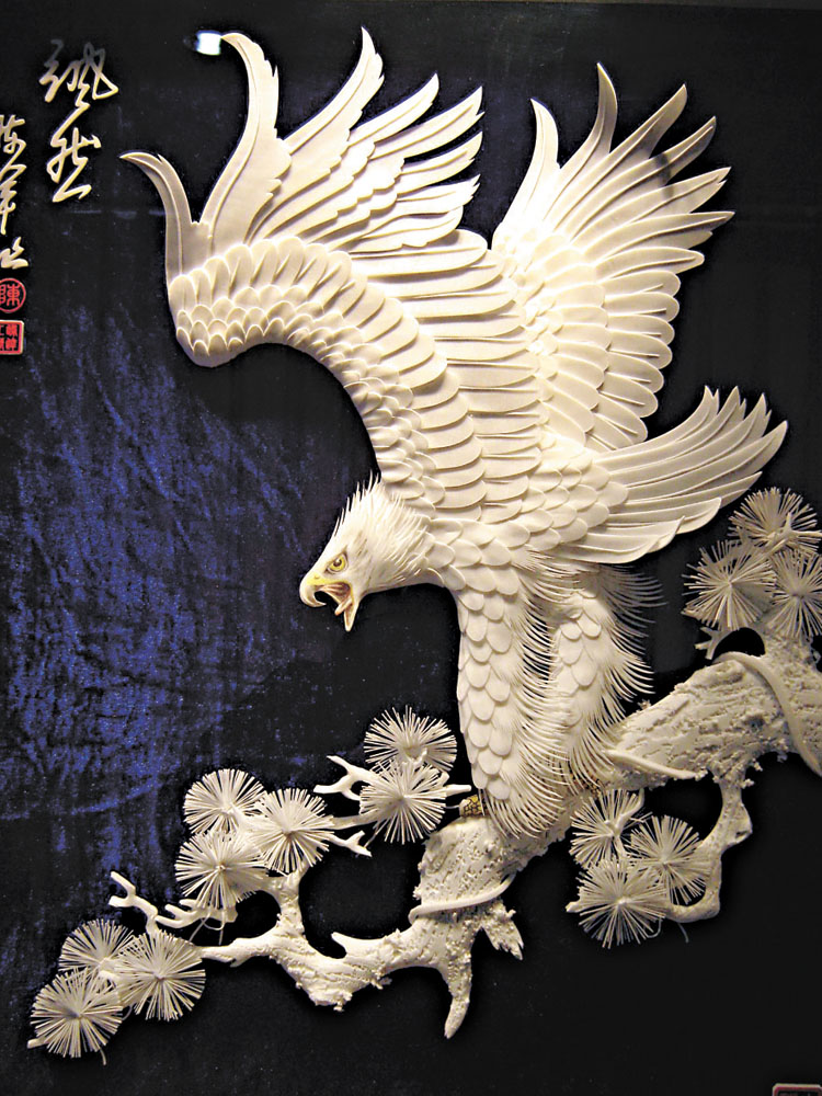 陳軍在古老單色平塗的基礎上創作出浮雕和立體雕塑,有素彩兩種之分,素取象牙白玉珍珠之雅美,彩納國畫工筆之精韻,是民間手工藝之精品。