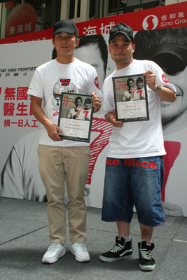 「無國界醫生日」榮譽行動大使林海峰(Jan)和葛民輝,昨出席「全城做義工捐一日人工」活動,期間二人與嘉賓們撐起寫上「7•7無國界醫生日」字樣的雨傘,無國界醫生香港辦事處總幹事溫達德頒發紀念品給他們。