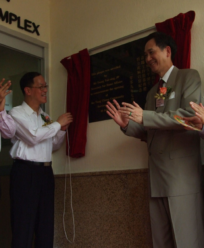 圖:曾德成(左)與林偉強(右)為東涌社區服務綜合大樓揭幕(本報攝)