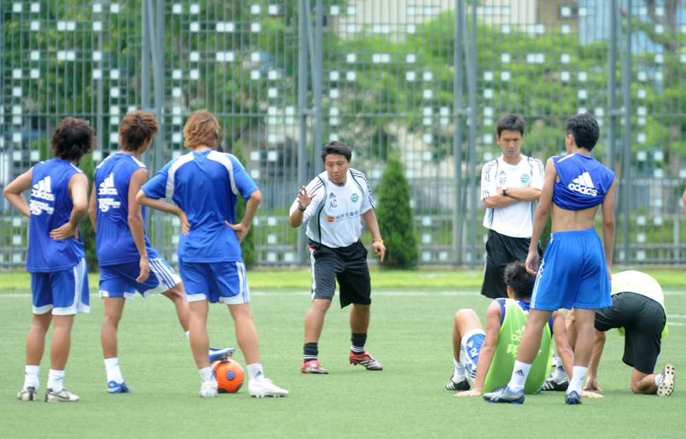 圖:大埔總教練張寶春(左四)昨在練習時指導球員(本報攝)