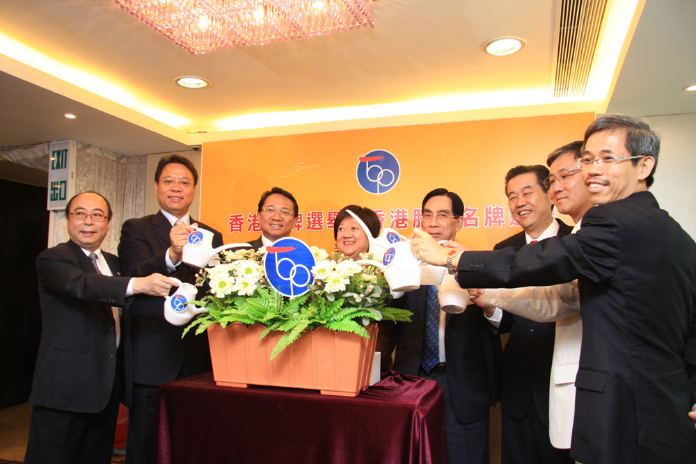 圖:香港品牌發展局主席陳淑玲(左四)率領一眾理事主持儀式,宣布新一屆「香港名牌選舉暨香港服務名牌選舉」展開(本報攝)
