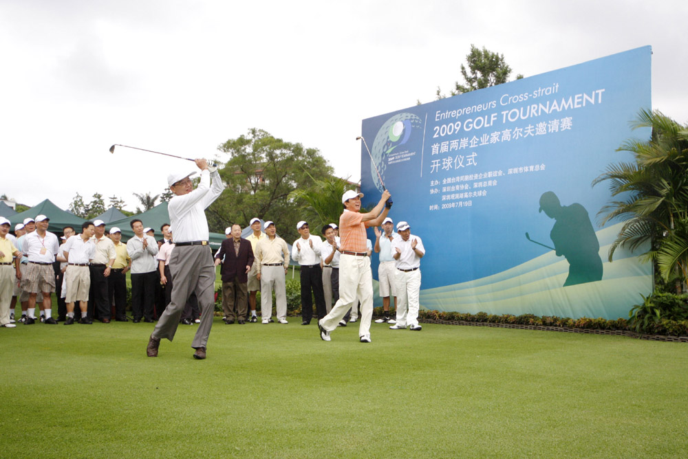 十九日清早,「莫拉菲」颱風在深圳前腳剛走,海基會董事長江丙坤(左)與海協會會長陳雲林(右)便迫不及待揮桿開啟「首屆兩岸企業家高爾夫邀請賽」儀式。 (本報記者唐剛強、毛麗娟攝)