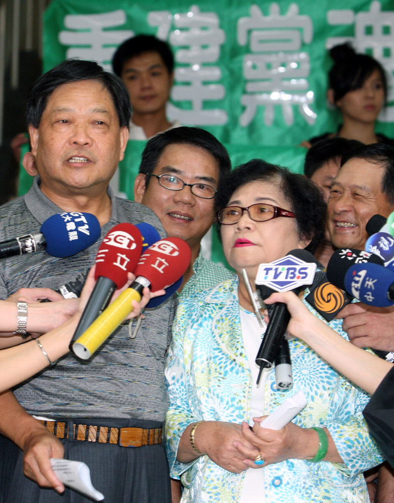 圖:前民進黨立委許榮淑(前右)、前農委會主委范振宗(前左)等人日前出席兩岸論壇,十九日返台,對於可能面臨黨中央黨紀處分,兩人不服,高分貝嗆聲。(中央社)
