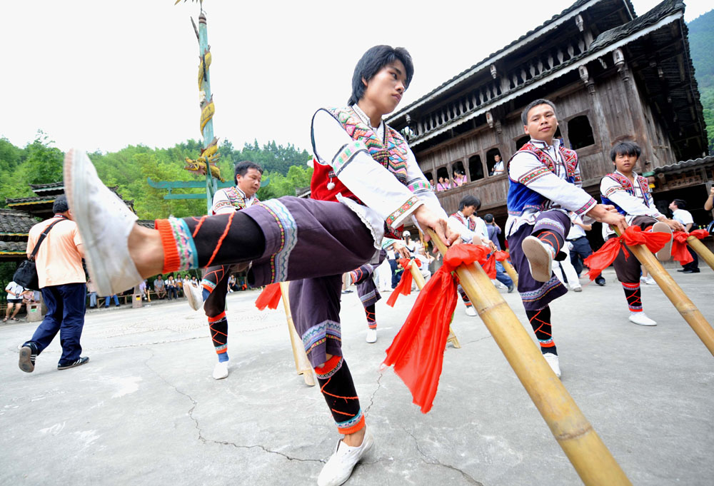 24日,廣西融水苗族自治縣「苗寨遊」進入旅遊旺季,能歌善舞的苗族男女青年表演的竹竿舞、拋繡球、苗族拉鼓和激烈精采的鬥馬等節目,讓遊客零距離感受原汁原味的苗族民俗風情。圖為苗族青年為遊人表演吹地筒。