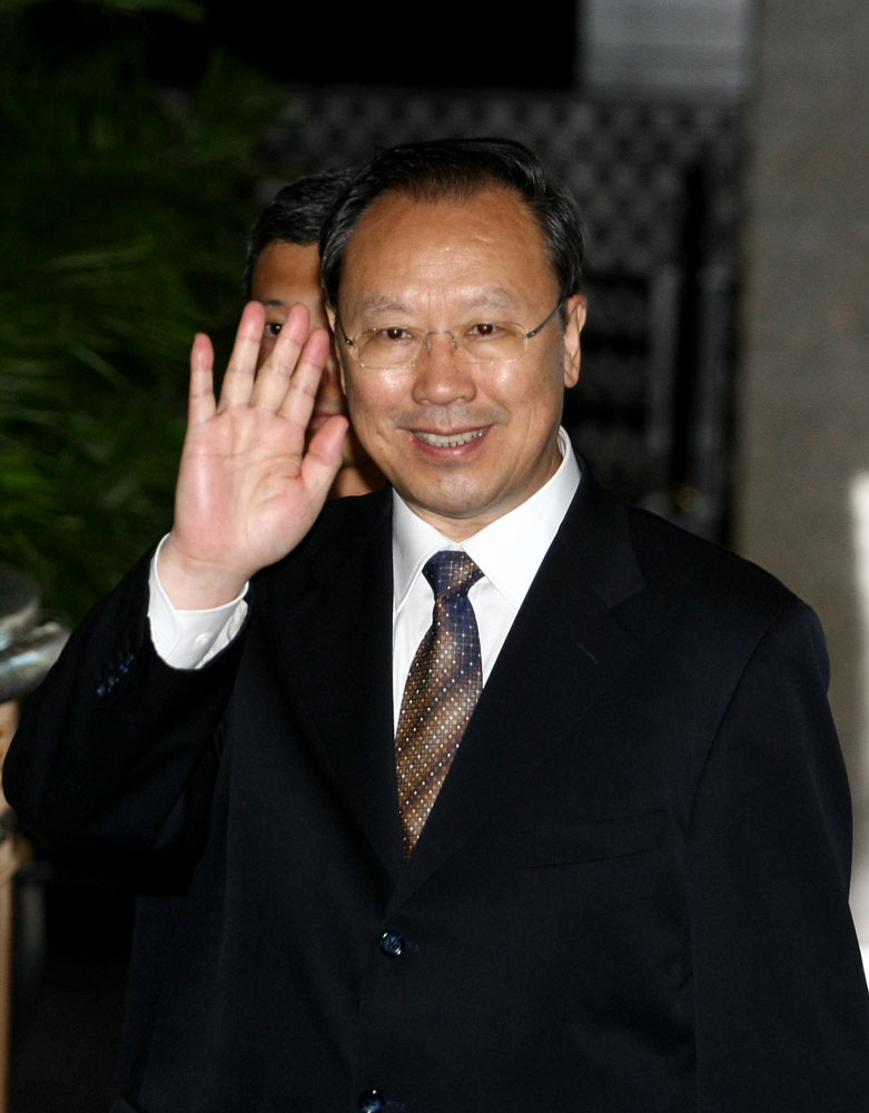 圖:杜青林在君悅酒店樓下向守候多時的記者問好