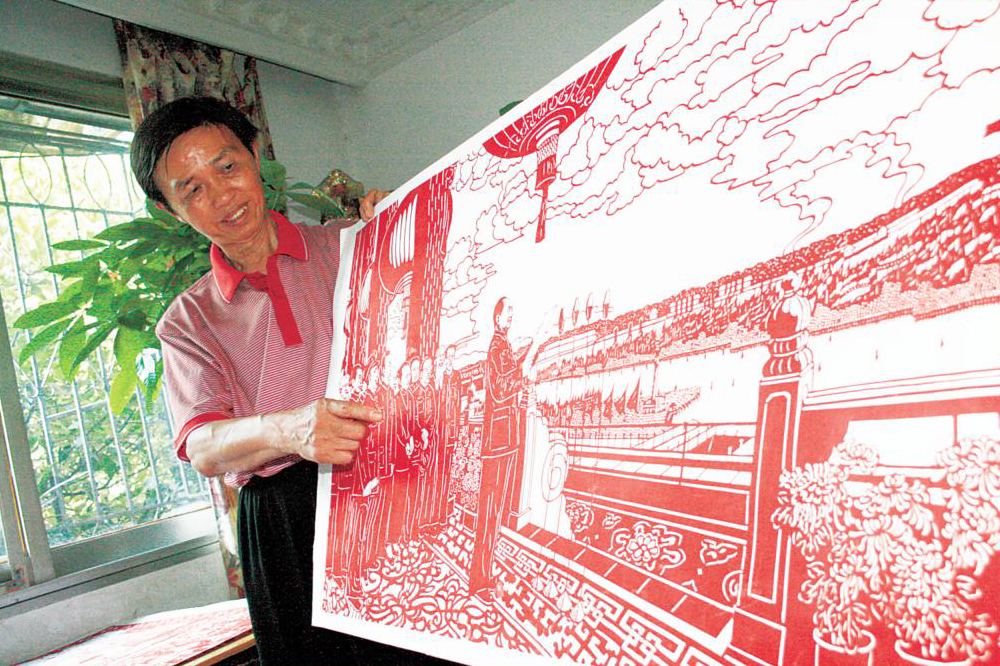 傳神的人物,壯觀的場面,長110厘米、寬77厘米的巨幅剪紙作品《開國大典》,栩栩如生地再現了「中國人民從此站起來了」這劃時代的一刻。在老人精細的刀工下,《開國大典》裡歡欣鼓舞的氣氛感染每一個欣賞作品的人。