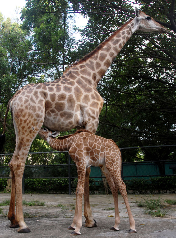 記者在深圳野生動物園長頸鹿館內見到了剛出生19天的小長頸鹿。牠身上的花紋十分漂亮,而「乳臭未乾」的小鹿頭頂還有一些絨毛,再加上一雙大大的眼睛顯得十分可愛。小長頸鹿的毛色深淺程度介於爸媽之間,不像爸爸「重九」那麼深,也不像媽媽「嬌嬌」那麼淺。專家分析,由於是長頸鹿不同亞種雜交的後代,所以這個小長頸鹿的誕生來之不易,同時牠的品種,較長頸鹿同一亞種繁殖的後代,將更加優良。