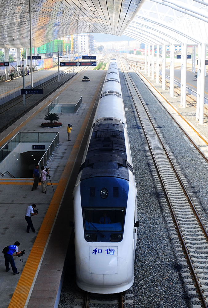 圖:遼寧省第一條城際鐵路開通運營,圖為一列「和諧號」車組三十日駛出瀋撫城際鐵路撫順北車站(新華社)