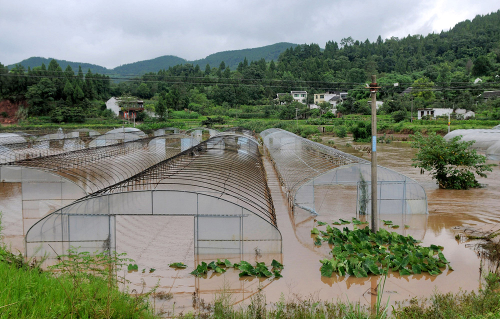 圖:自7月31日起,四川省西充縣遭暴雨襲擊,截至8月1日下午15時,西充縣過程降雨量達到200毫米以上,給當地農作物造成較大損害。圖為被淹的四川省西充縣常林鄉蔬菜大棚(新華社)