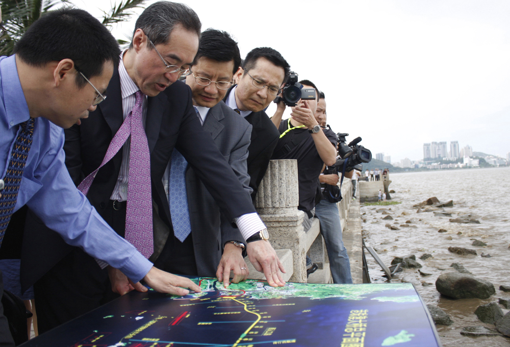 圖:早前香港政務司司長唐英年(左二)一行抵達珠海拱北灣,察看珠、澳口岸填海建人工島進展(本報攝)
