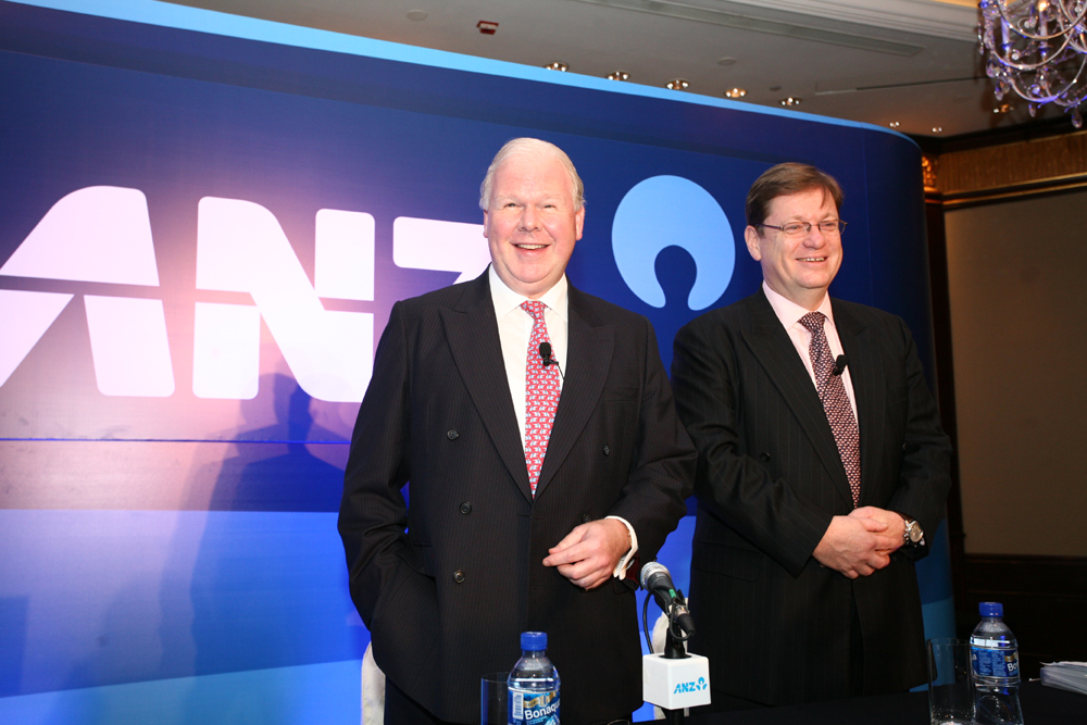 圖:澳紐銀行總裁邵銘高(左)及澳紐亞太區、歐洲及美洲總裁范思博宣布進軍亞洲大計(本報攝)