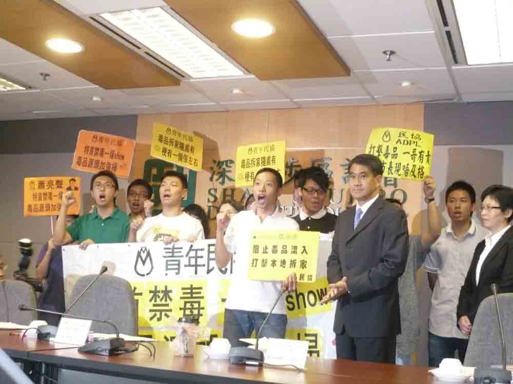 圖:有團體向鄧竟成(前右一)遞信,要求警方與內地公安合作堵截毒品源頭(本報攝)