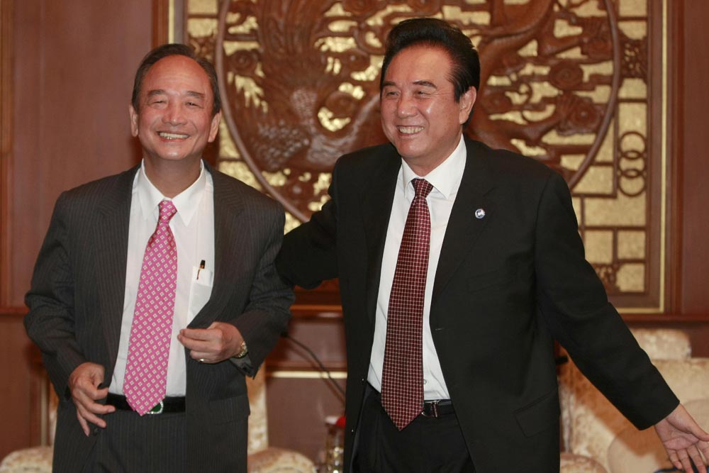 圖:全國政協常委、政協港澳台僑委員會主任、海協會會長陳雲林(右)在北京釣魚台國賓館,會見了以鄭逢時(左)為團長的台灣各界知名人士訪京團 (中新社)