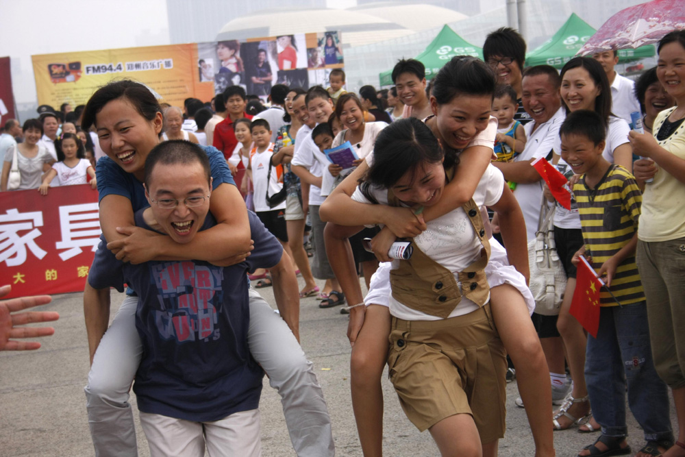 河南省鄭東新區如意湖畔8日下午舉辦「背媳婦比賽」,吸引眾多中青年參與,一對沒有男朋友的女青年,為了參加比賽,臨時上演了女人背女人的另類「背媳婦比賽」。(中新社)