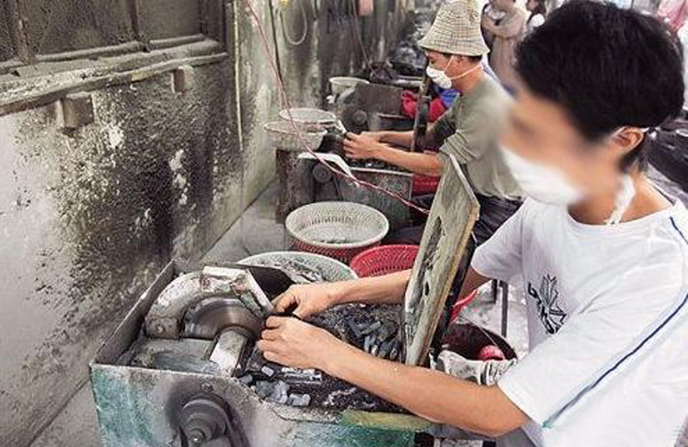 圖:大批工人用打磨機將切片後的灰白瑪瑙磨出天珠的形狀