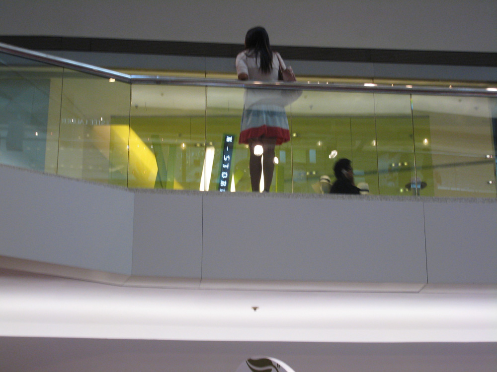圖:女士站在又一城透明玻璃圍欄旁邊,有走光危機(民建聯提供)