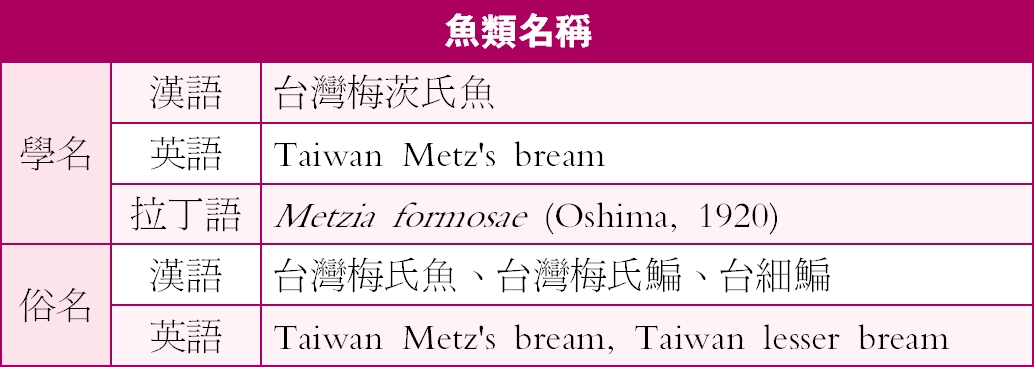 「台灣梅茨氏魚(Metzia formosae)」由日本魚類學家大島正滿(Oshima Masamitsu, 1884-1965),在一九二○年費城自然科學學院會議報告(Proceedings of the Academy of Natrual Sciences of Philadelphia)第72卷所發表的文章《臺灣淡水魚類之記述,付新屬與新種的描述》(Notes on freshwater fishes of Formosa, with descriptions of new genera and species)」中,以「台細鯿(Rasborinus formosae)」的學名首次被記載。