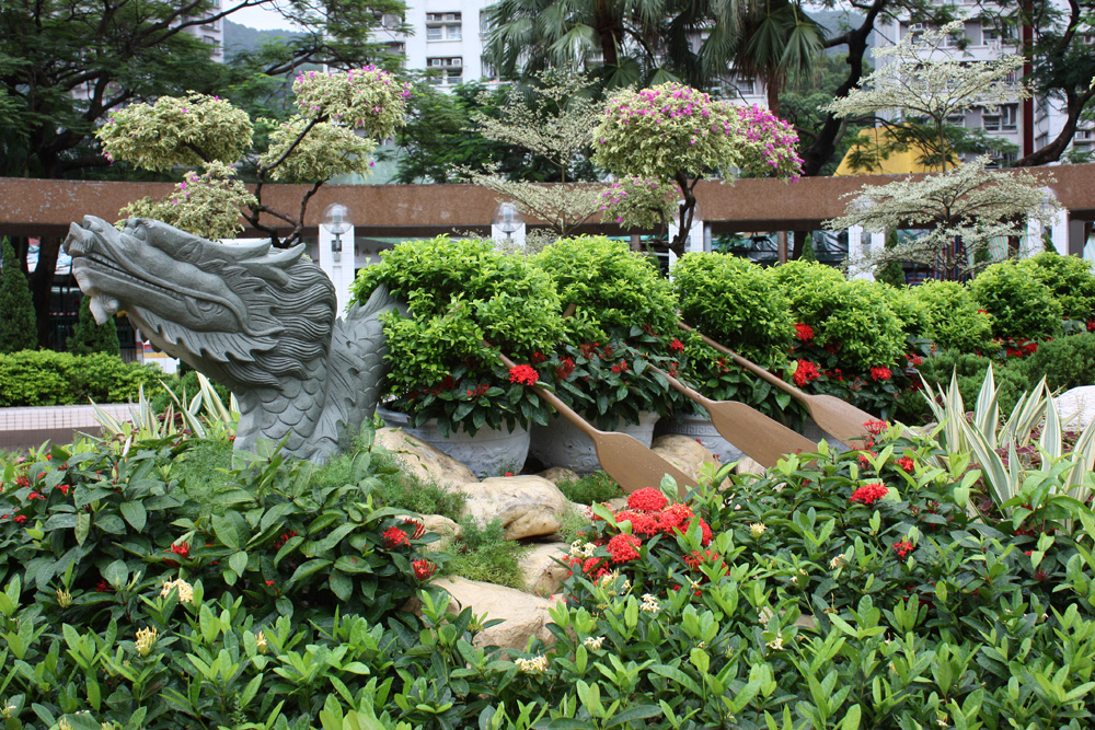 【本報訊】為綠化屋邨,房屋署在不同屋邨推行主題園圃,本年最新完成的園圃,則位於大圍隆亨邨,該屋邨的園圃以種植龍船花為主,並配合龍舟外形的設計,令屋邨更有生氣。