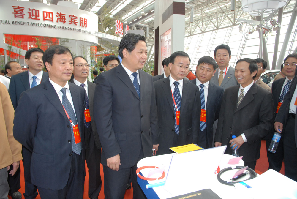 圖:淮南市市委書記楊振超(左二)、市長曹勇(左三)視察第四屆中國中部投資貿易博覽會淮南展位
