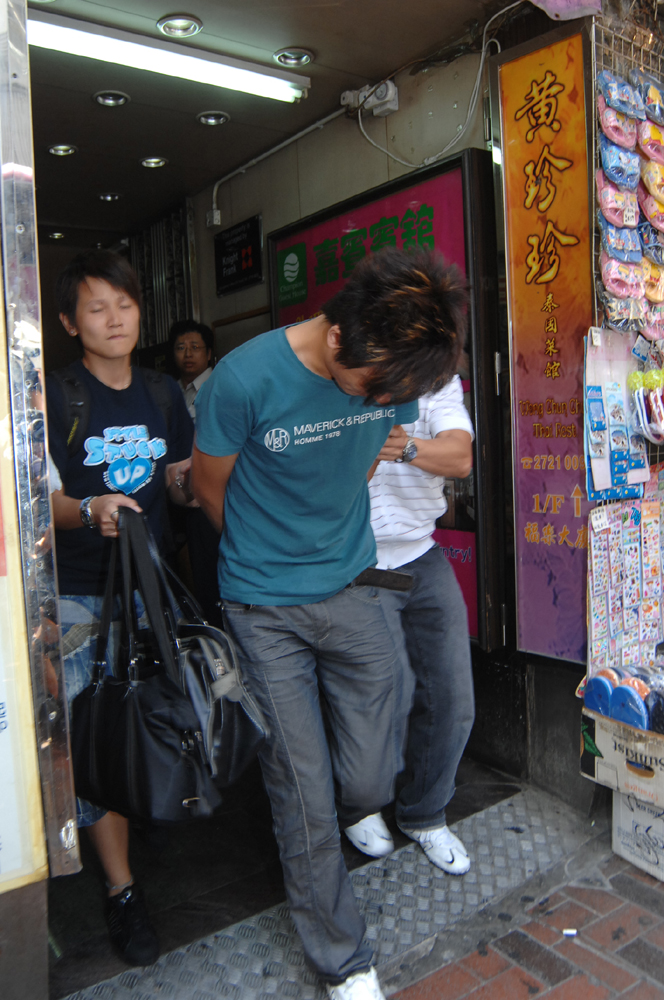 警方早前接獲線報,上星期五開始部署行動,昨晨派出三名探員扮作嫖客,先後在油尖區華豐大廈、福樂大廈及美麗都大廈拘捕三名二十二至二十五歲持雙程證來港的遼寧人,他們涉嫌違反逗留條件罪名。其中一名男妓身高六呎,警方特別派出身材較高大的探員負責放蛇行動及拉人,過程中涉案六呎男一度反抗,但最終被探員制服。另外兩名男妓被扣上手銬後,由探員押上警車。