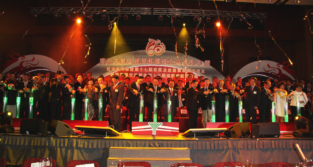 □香港青年聯會日前在香港會議展覽中心舉行「慶祝中華人民共和國成立六十周年暨香港青年聯會第十七屆會慶及會董會就職典禮及香港青聯交流基金第十三屆理事會就職典禮」。中華全國青年聯合會副主席廖明宏、黃英豪、曾智雄;中聯辦副主任王志民;外交部駐港特派員公署副特派員高玉琛;民政事務局局長曾德成;政制及內地事務局局長林瑞麟;發展局局長林鄭月娥;中央政策組首席顧問劉兆佳應邀出席主禮,場面熱鬧。\本報記者 黃穎雅