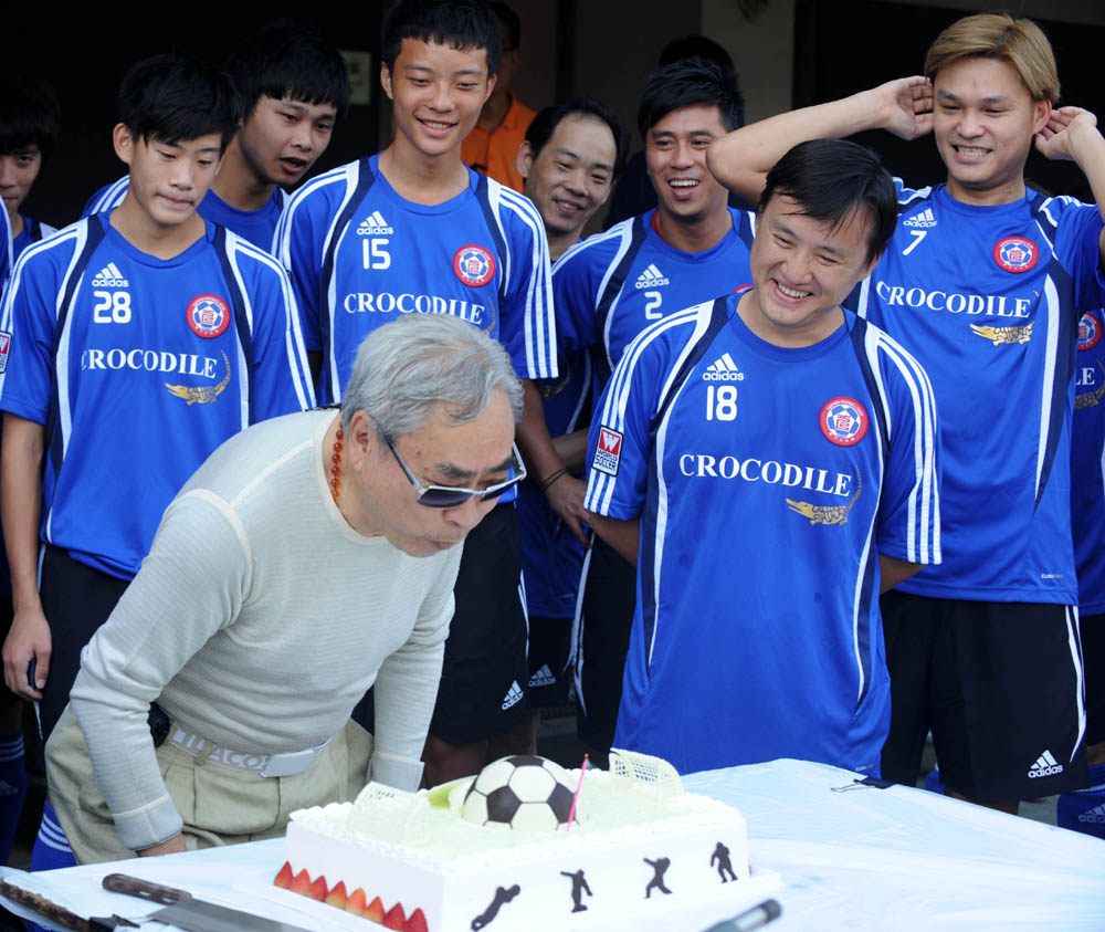 圖:東方職球員昨日祝賀球隊會長林建名(前排左)72歲大壽(本報攝)