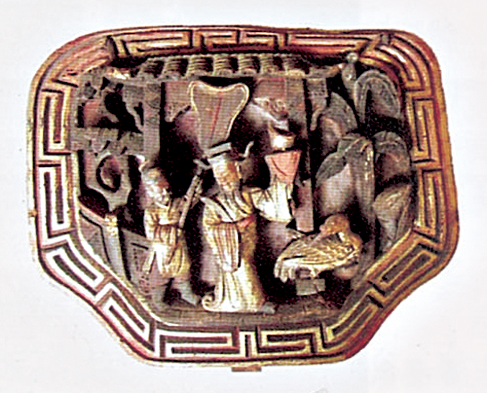 圖中的這塊木雕高29厘米,寬40厘米,厚14厘米,呈倒元寶形,俗稱「樑托」,是民宅、祠堂古建築上的輔件裝飾件。該木雕圖四周為流暢的回字連花紋,主圖為古代戲劇,其中一頭戴官帽、身着官袍的官人笑容可掬,鬚髯飄逸,左手舉托一酒杯,右手緊扶腰佩帶,懷抱朝笏;侍從雙手執扇緊隨,一仙鶴悠閒自得地在梳理羽毛,白果樹枝繁葉茂,芭蕉樹青翠欲滴;假山、走欄、庭院重檐飛翹,景、物層次分明,人物、動物眉眼畢現,栩栩如生,惟妙惟肖。該木雕採用多層透雕手法,整幅畫面塗金描彩,十分精美。